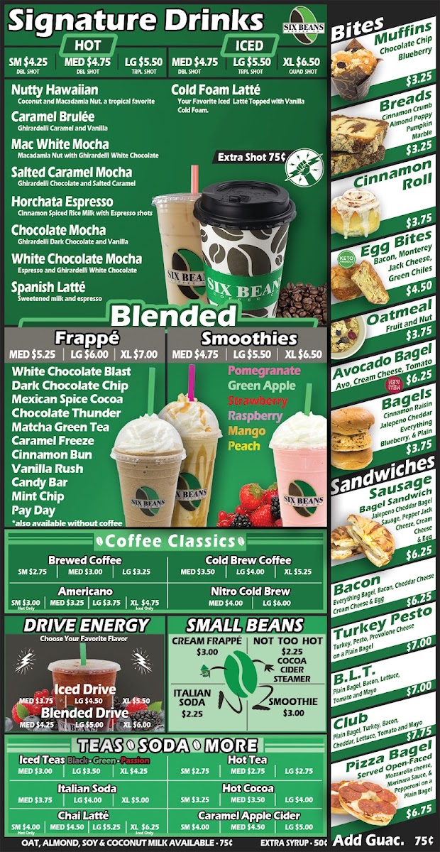 At Six Beans Coffee Co., every sip is a celebration. They expertly craft a range of frappe drinks that cater to diverse palates. Indulge in the smooth elegance of the Vanilla Rush Frappe, where lush vanilla takes center stage. Or perhaps the Horchata Frappe will tempt you, infused with a delightful cinnamon-kissed sweetness that will whisk you away to a world of bliss. For those yearning for an exhilarating twist, the Chocolate Thunder offers a bold and electrifying experience, making it a true standout on the menu.